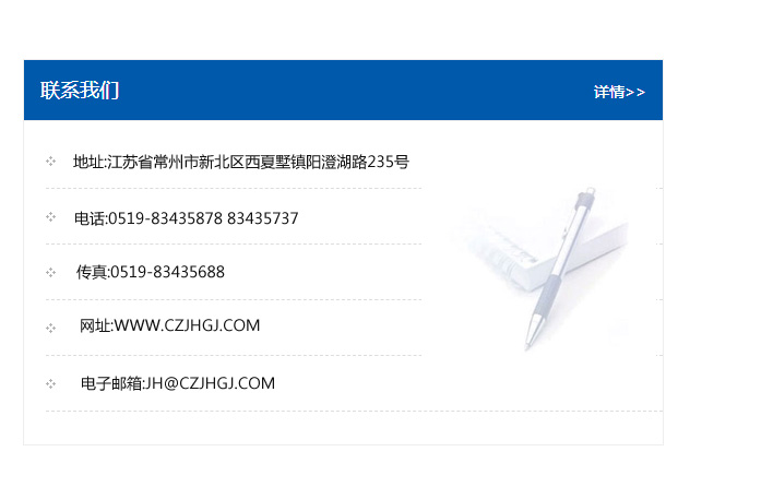 地址:常州市新北區友邦商務大廈1幢16、17層  電話:0519-85101652  傳真:0519-85112595  郵編:213022  網址:www_cz-jiayue_cn.love-mv.com  郵箱:xiajifengaa@163.com